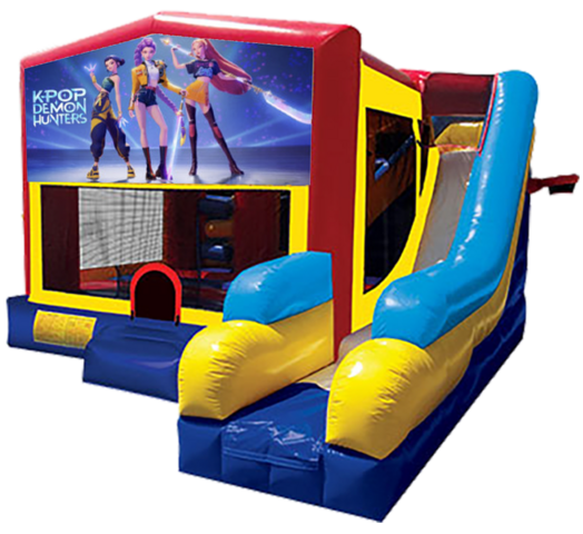 Supersize your combo fun with this K-Pop Demon Hunters themed Backyard Combo that's sure to be the HIT at your next party! Enough room for a party of kids with plenty of fun activities such as bouncing, climbing, sliding, shooting hoops (no balls included) and obstacles! Please note that price listed is for DRY slide and this item is upgradable to a water slide. This unit features a safety step for easy and safe entry and exit, knotless netted windows to protect small fingers and give great visibility for parents and and meets all current safety regulations